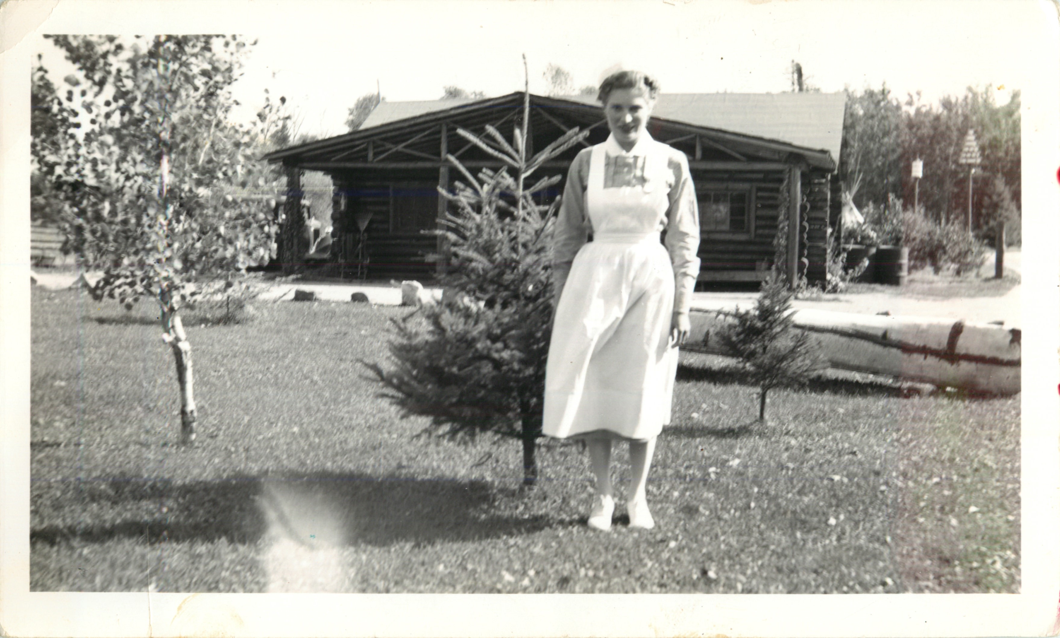Belva Nelson in nurses uniform in front of store early 1940's