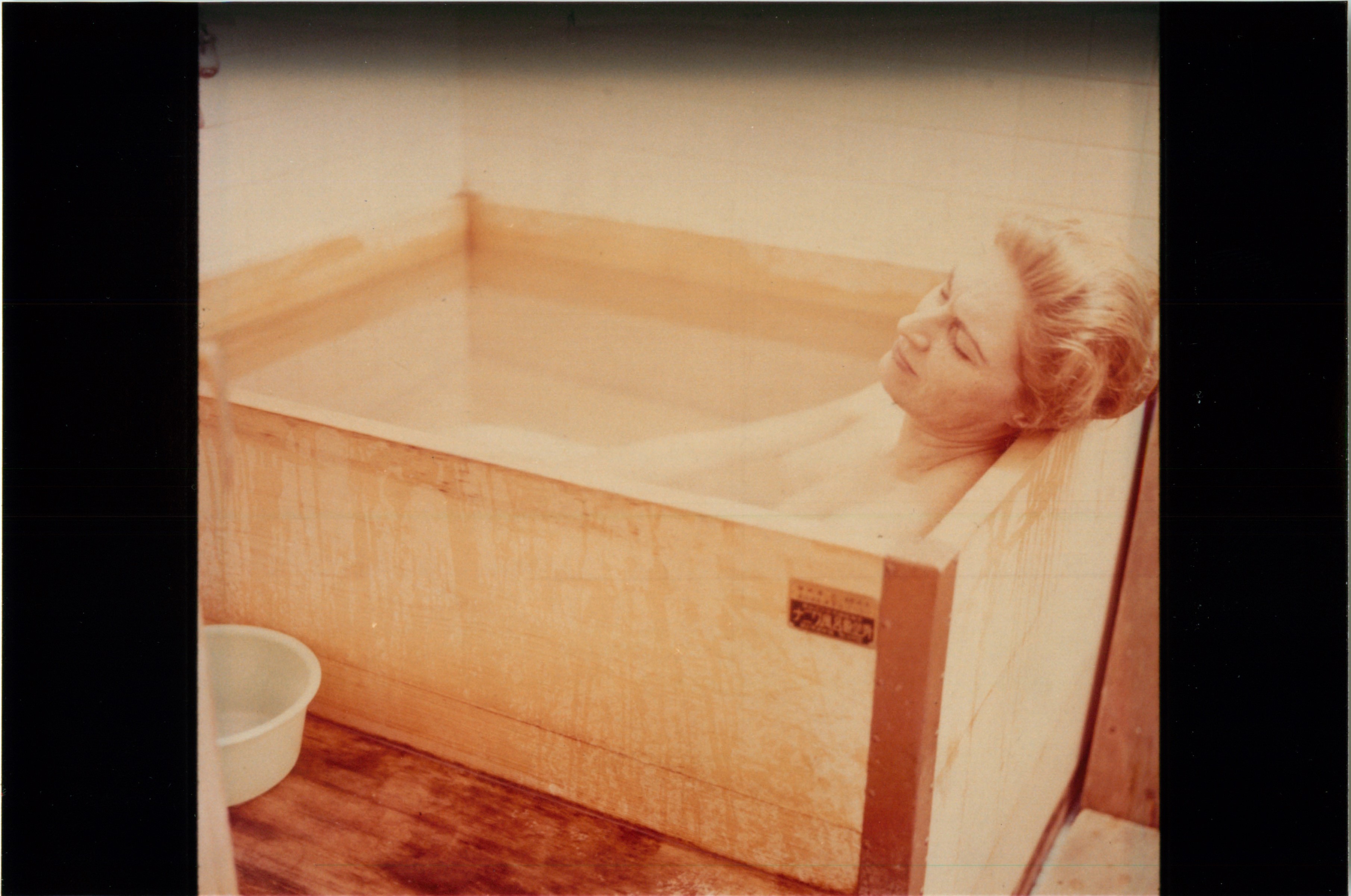 Belva soaking in Japanese hot tub in Japan