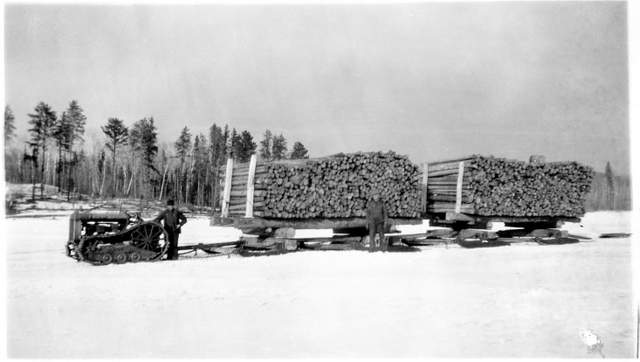 Tractor hauling logs on snow