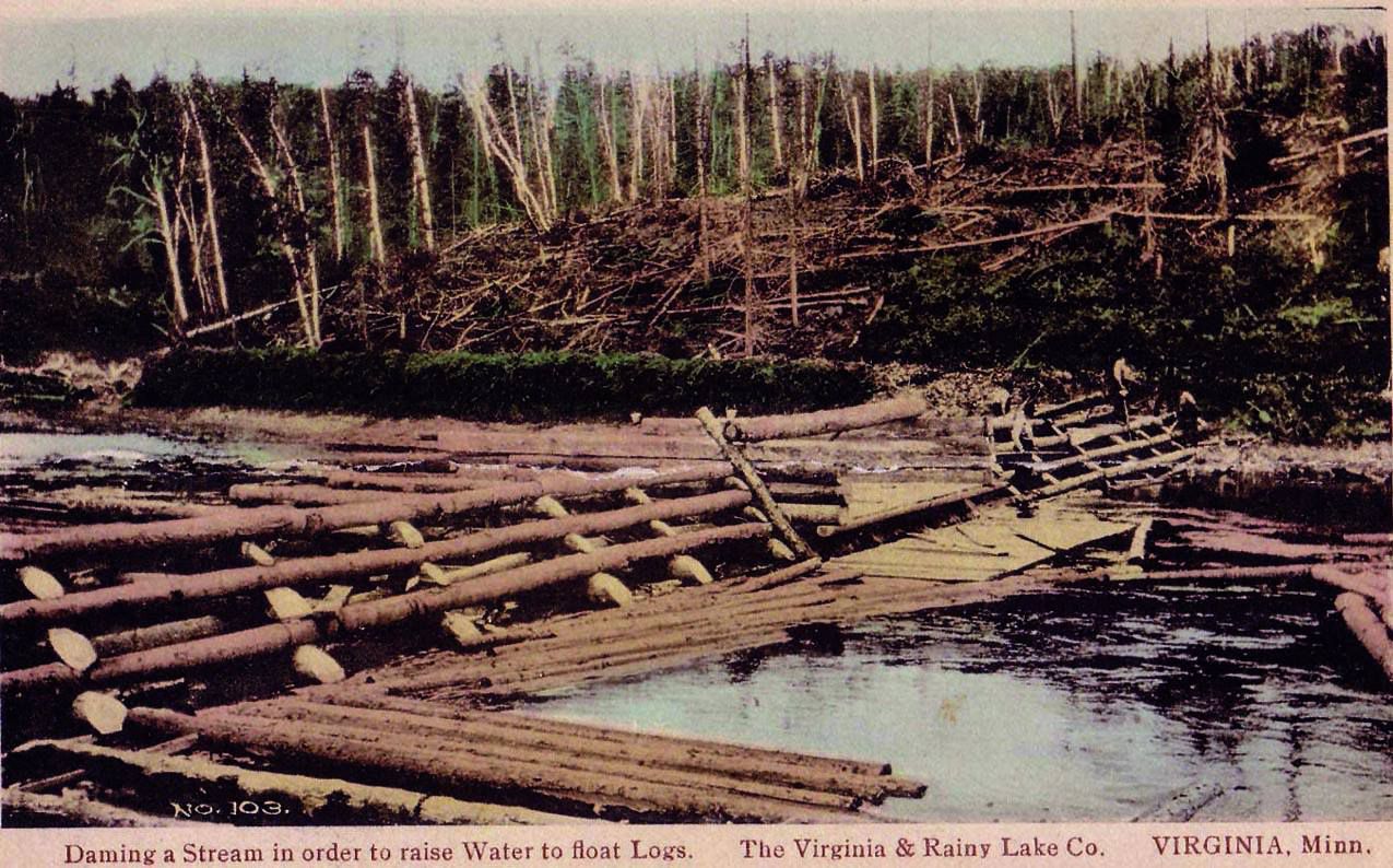 Damming a stream in order to raise water to float logs