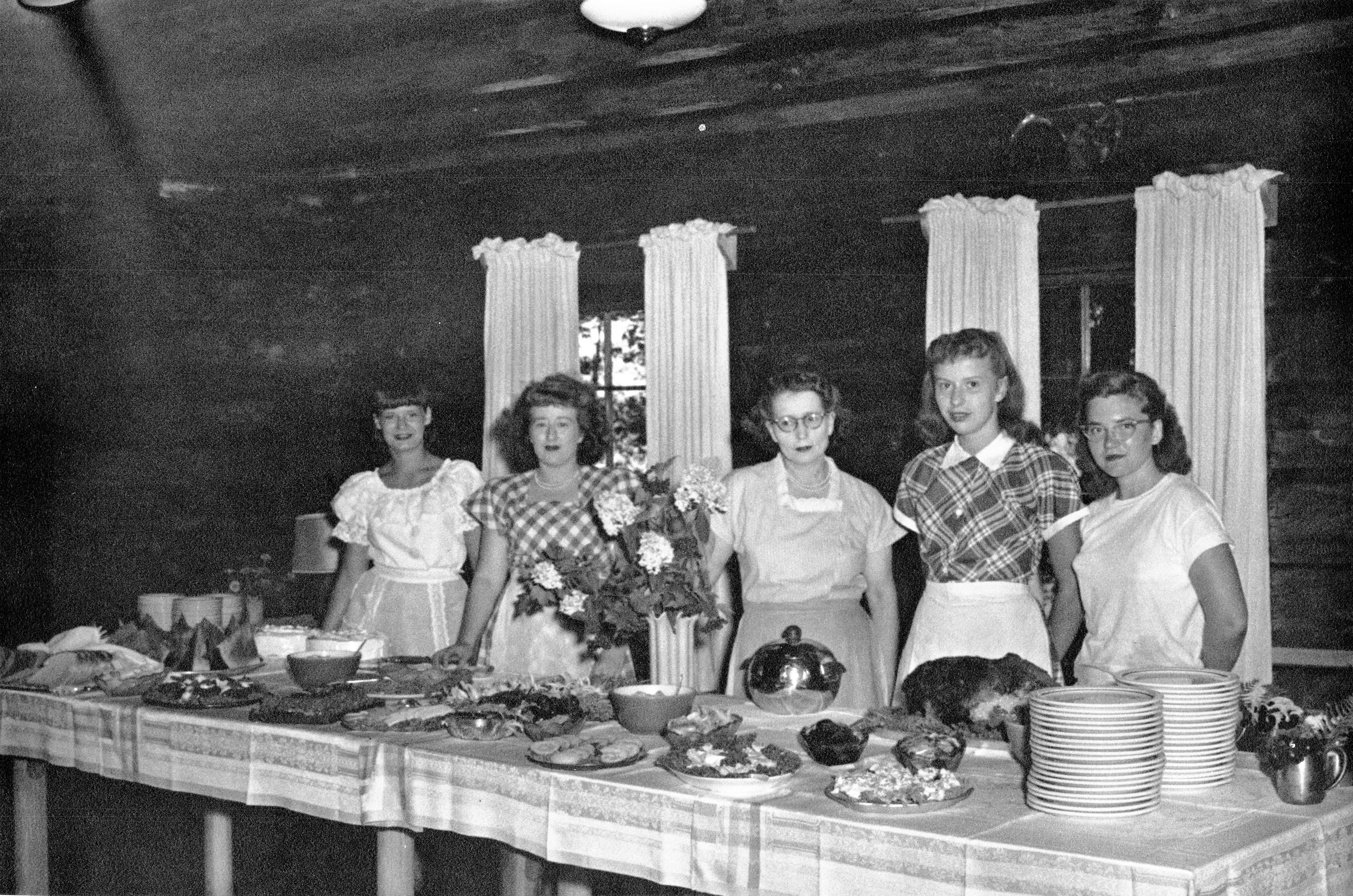 Nelson's First Smorgasbord L to R unknown, Nancy O'Neil, Carol O'Neil (Mrs. Glenn Neil) and her unknown friend August 1949