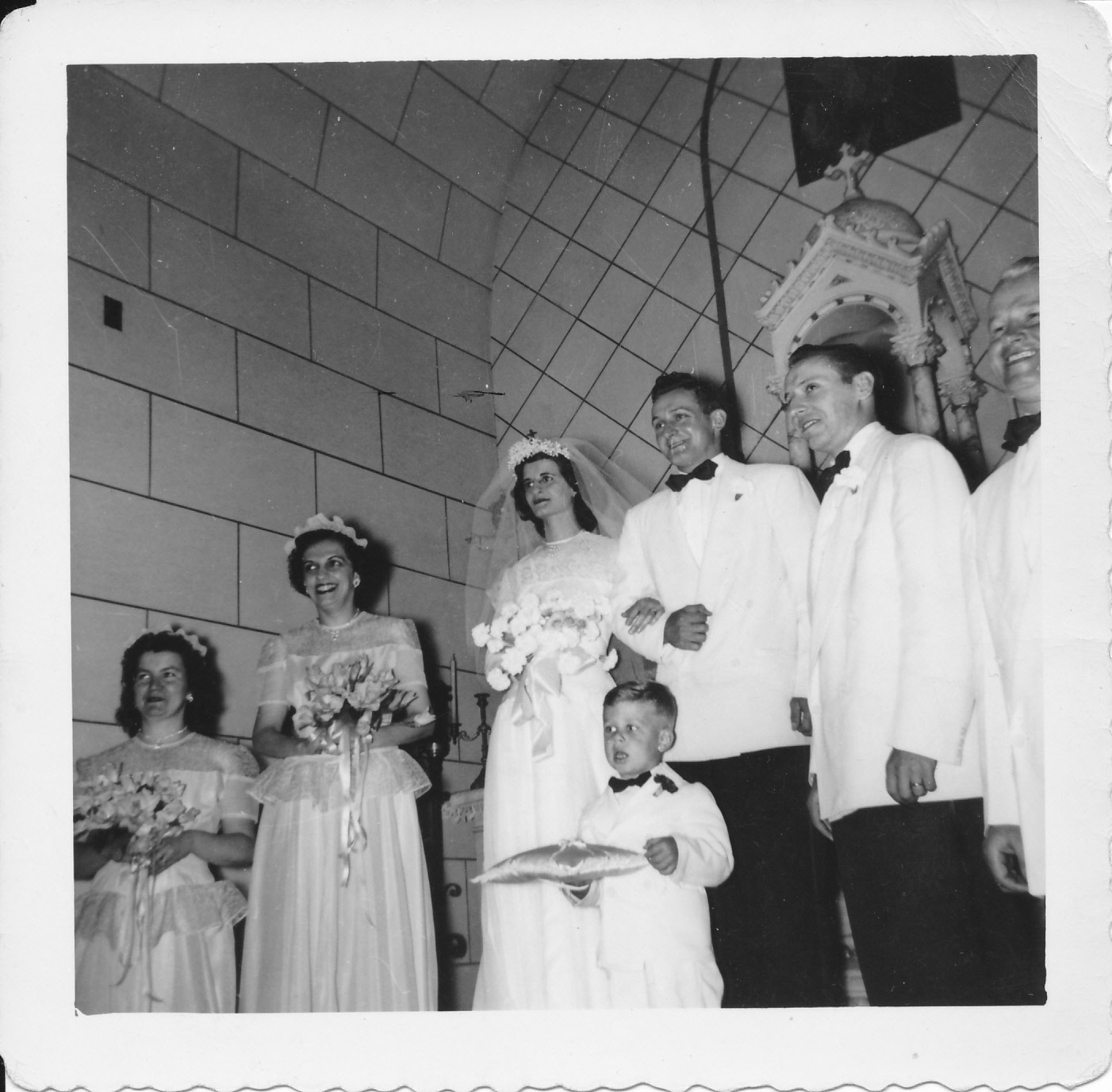 Uncle Ed and Aunt Lou Lou next to Auntie El Uncle Ed next to Les Tommy holding pillow and the wedding ring